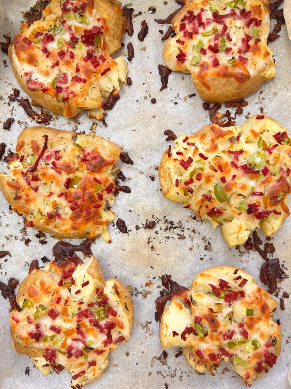 Jalapeño Popper Smashed Potatoes are crispy on the outside and loaded with cheesy, spicy flavor inside. These bite-sized potatoes are perfect for tailgates, game day parties, and serving a crowd that loves bold, comfort food.