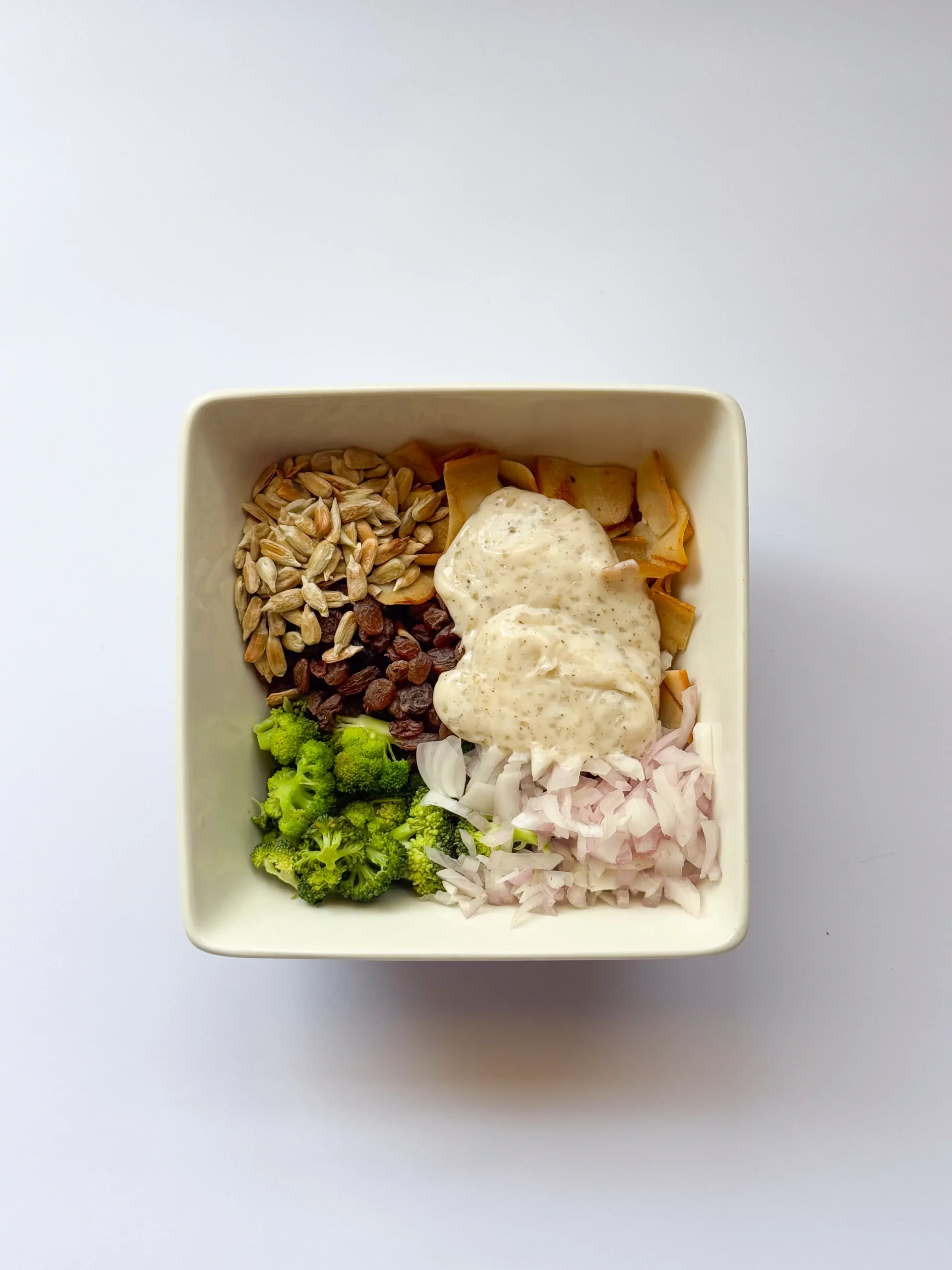 - Now, I assemble the salad. In a big bowl, toss together the chopped broccoli, crumbled bacon, raisins, sunflower seeds, and red onions. Pour the dressing over it and mix until everything’s evenly coated.