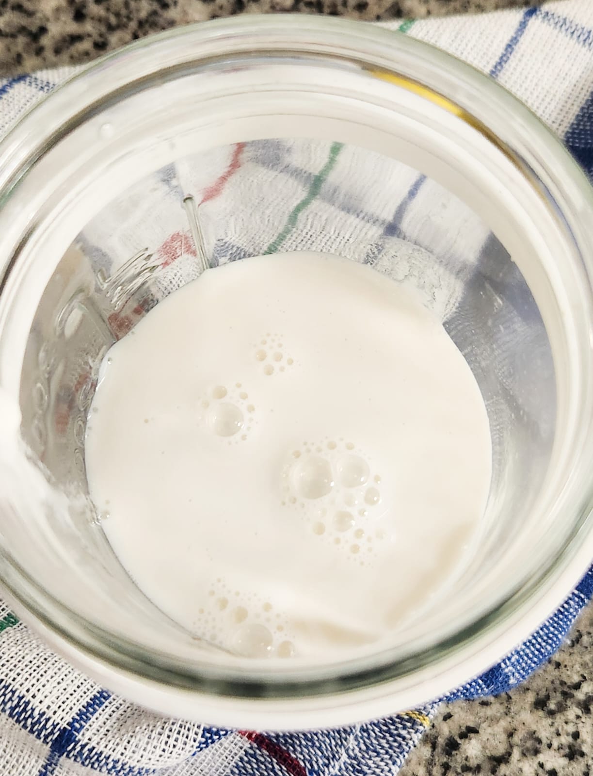Pour in the milk next, then add the yogurt so the mixture gets creamy. Add the vanilla extract and honey last for flavor and sweetness. Stir or close the jar and shake briefly until the ingredients look evenly mixed.