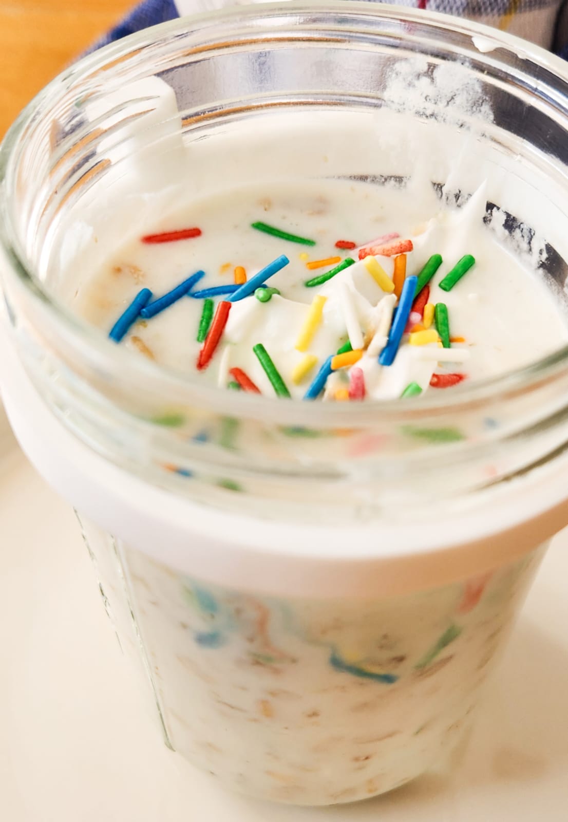 Open the jar and give the oats a quick stir to smooth the texture. Spoon on a little whipped cream and a pinch of extra sprinkles for the birthday look. Eat straight from the jar or transfer to a bowl if you prefer. If it’s too thick, add a splash of milk and stir until it feels right.