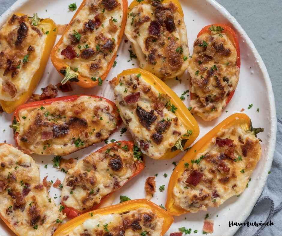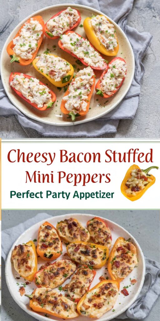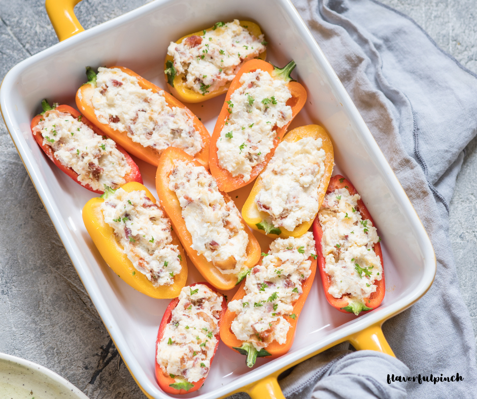 - Take your mini sweet peppers, halved and seeded, and remove any remaining membranes for a tender bite. Use a spoon to fill each pepper half with a heaping tablespoon of the cheese-bacon mixture, pressing gently so the filling stays in place.