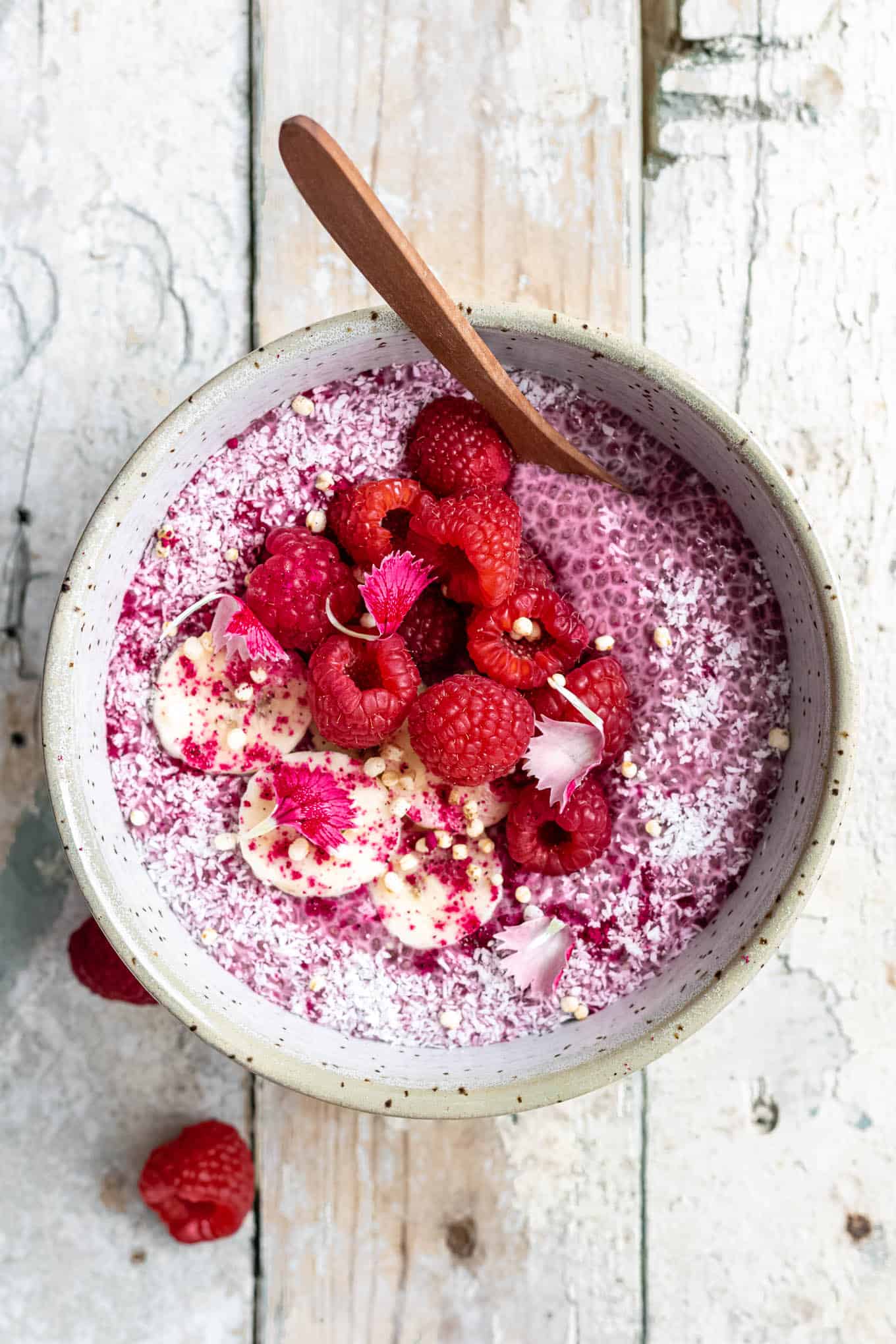 Chia pudding thickens naturally thanks to chia seeds’ superpower absorption, creating a pudding-like texture that’s more filling than oats.