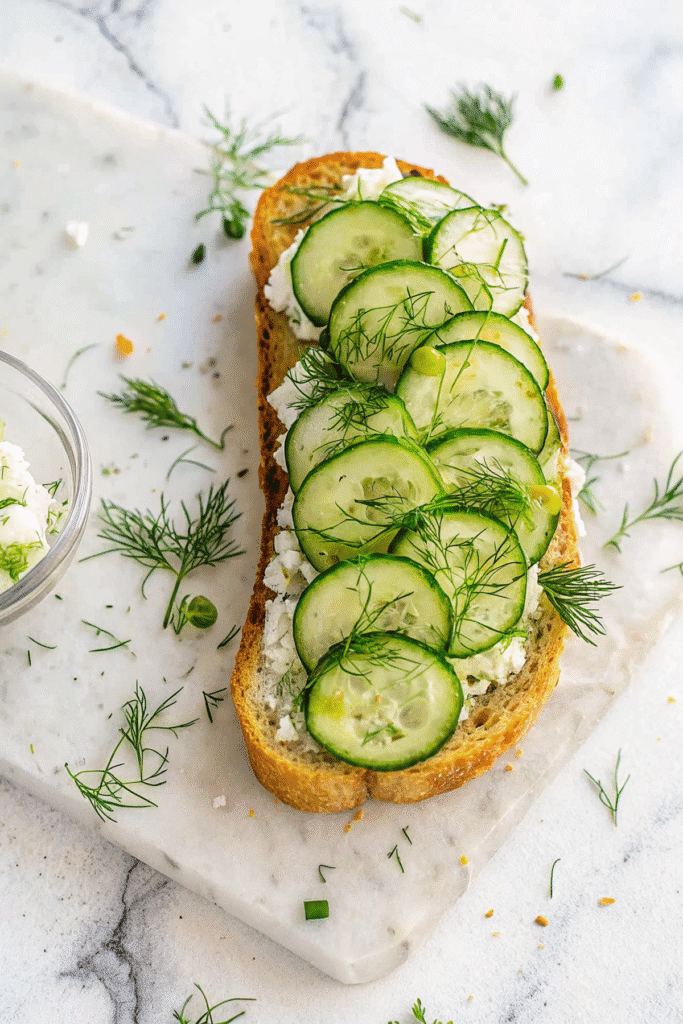 - Top with cucumber slices and serve.