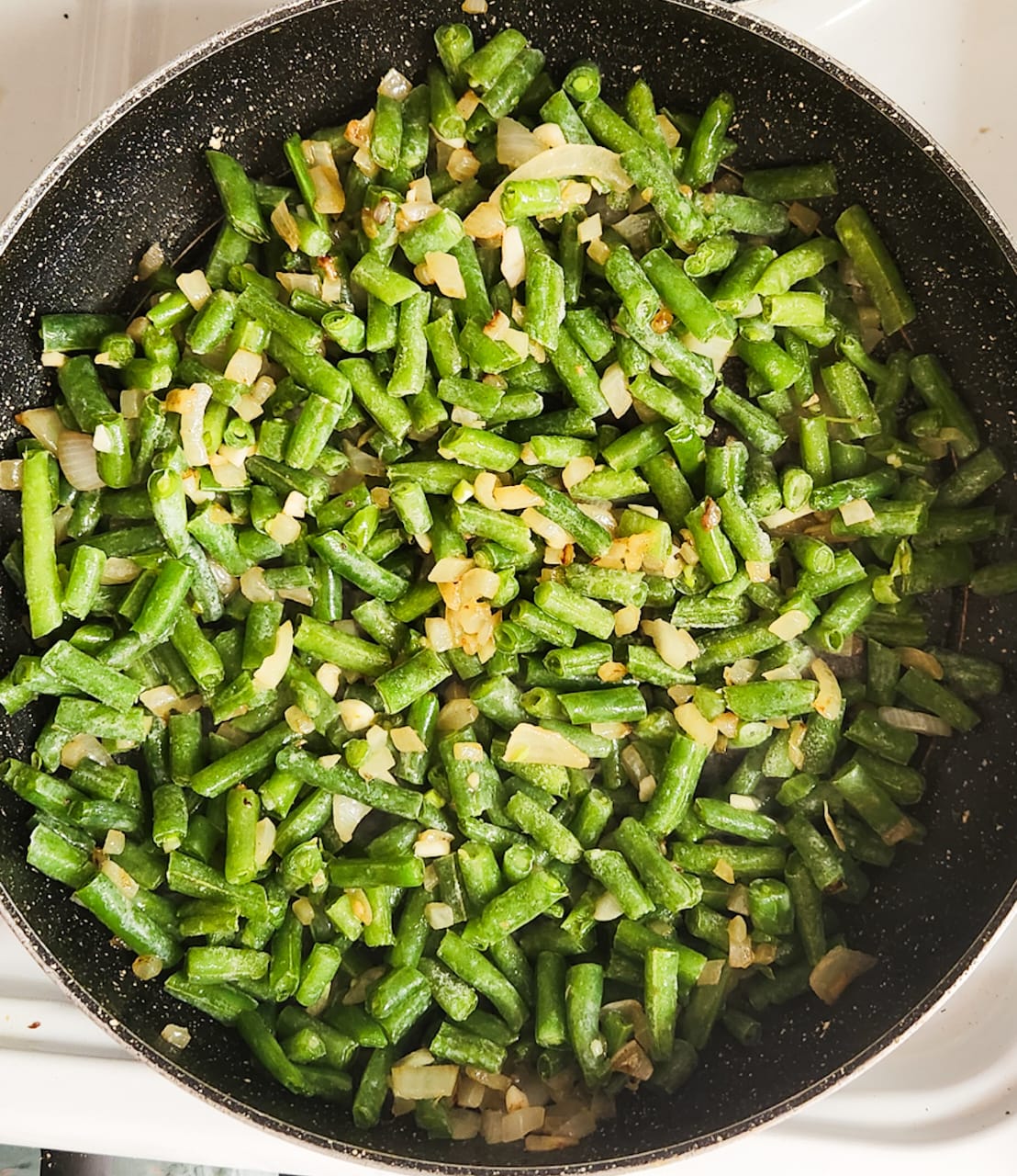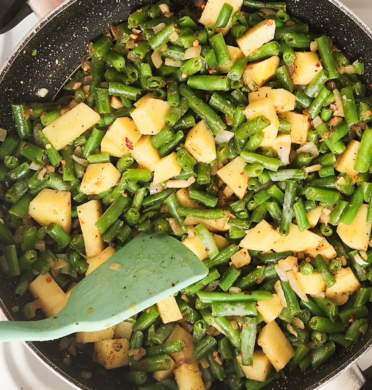 Stir in green beans and potatoes. Cook for 5 minutes to lightly coat and begin softening the vegetables.