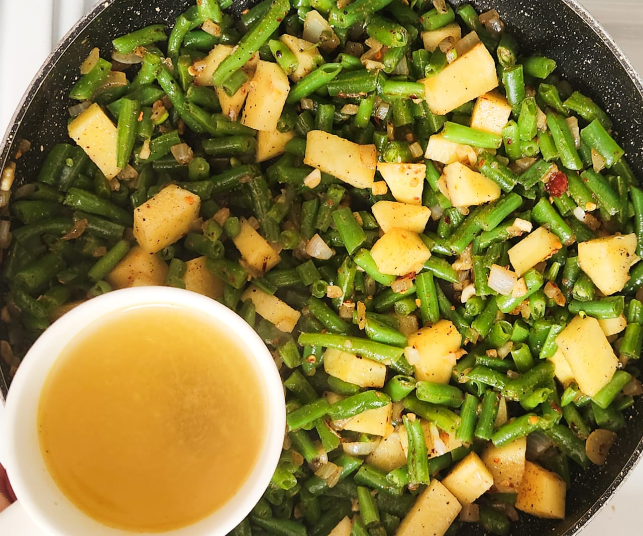 Once boiling, reduce the heat to low (a gentle simmer). Cover (or partially cover) and let it cook for about 20–25 minutes, stirring occasionally, until the green beans and potatoes are tender when pierced with a fork.