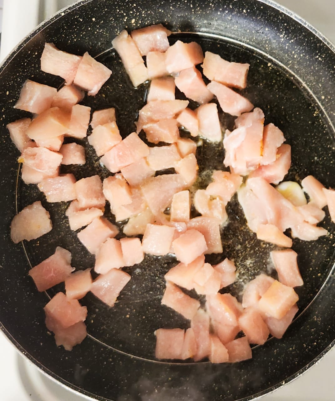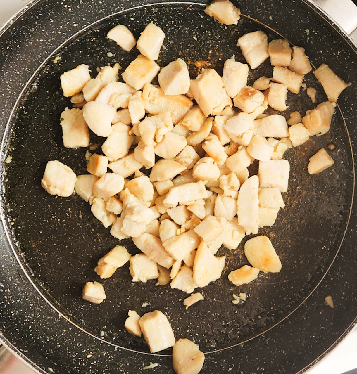 Place a large skillet or Dutch oven over medium heat. Add the diced chicken breast in a single layer. Cook it slowly, stirring now and then, until the chicken pieces are golden brown and crisp — this usually takes about 8–10 minutes.