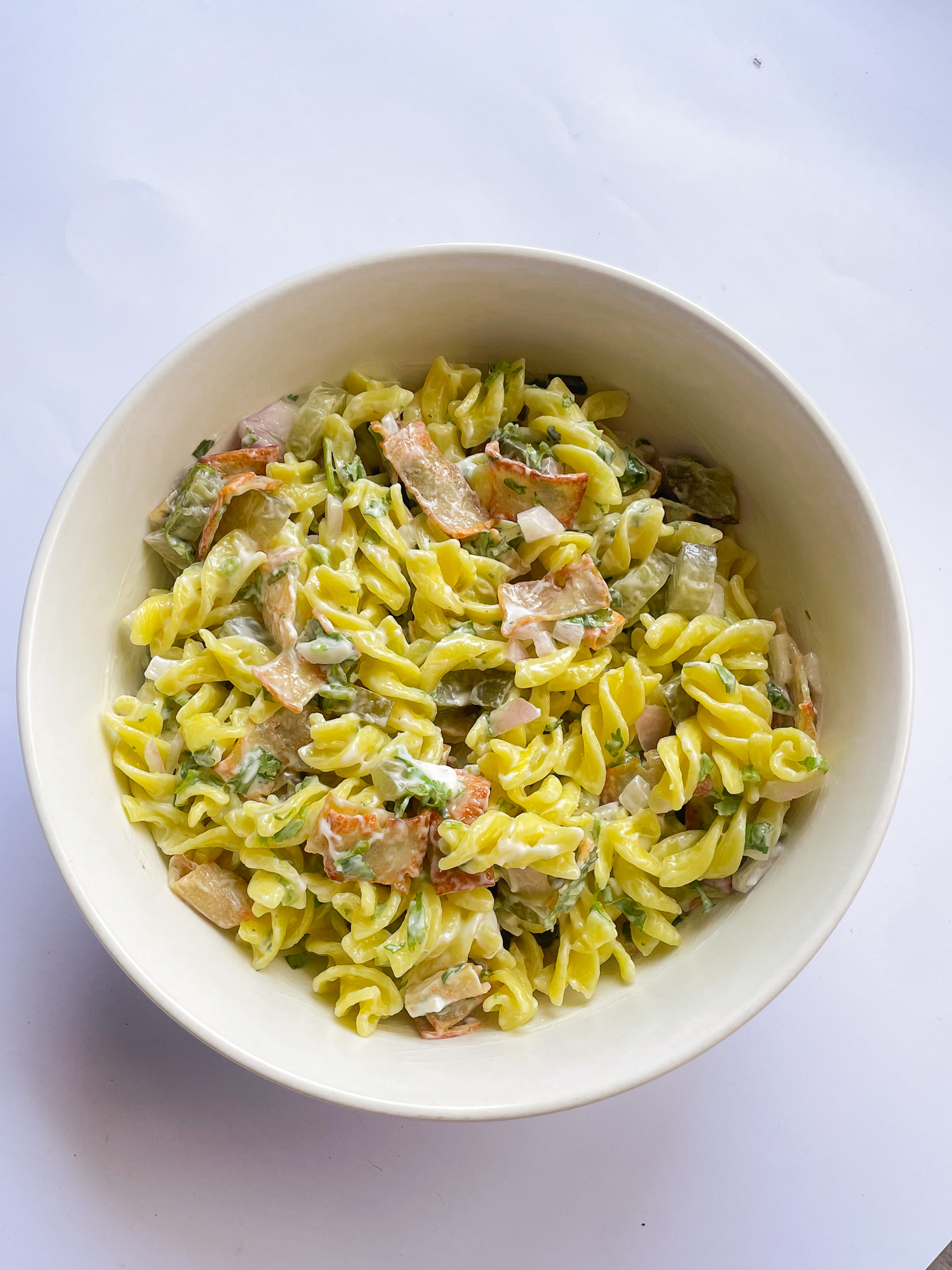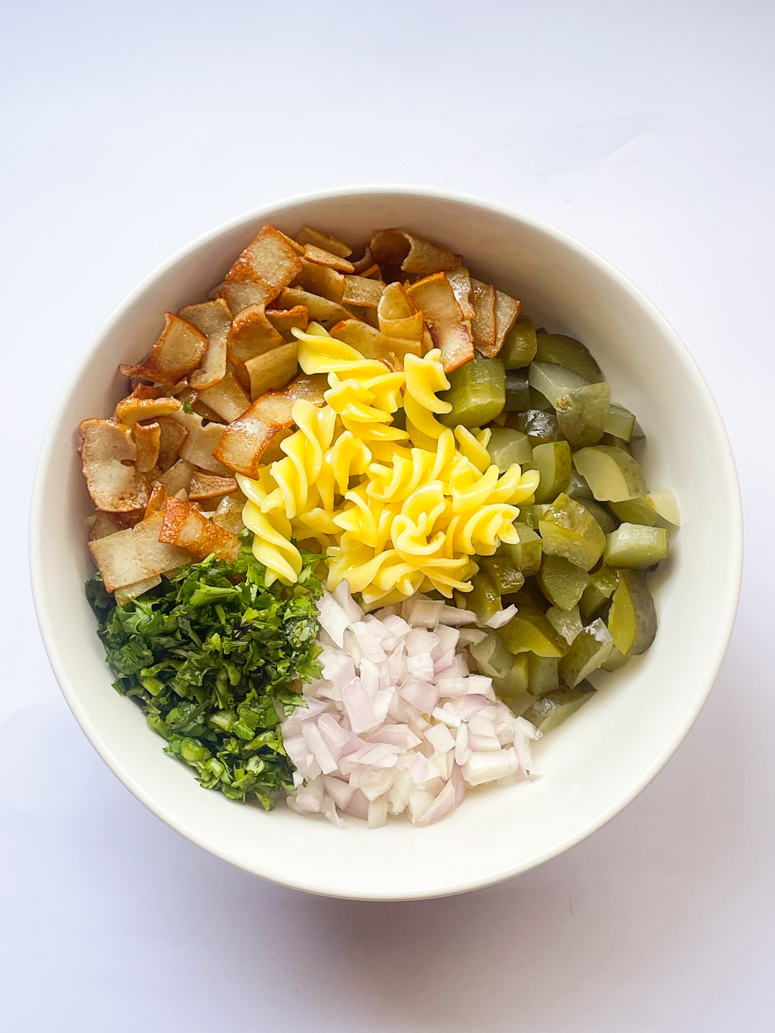 • Once the bacon is cooked and the vegetables are chopped, I combine everything in a large bowl. I add the cooked pasta, chopped pickles, red onion, crumbled bacon, and fresh dill.