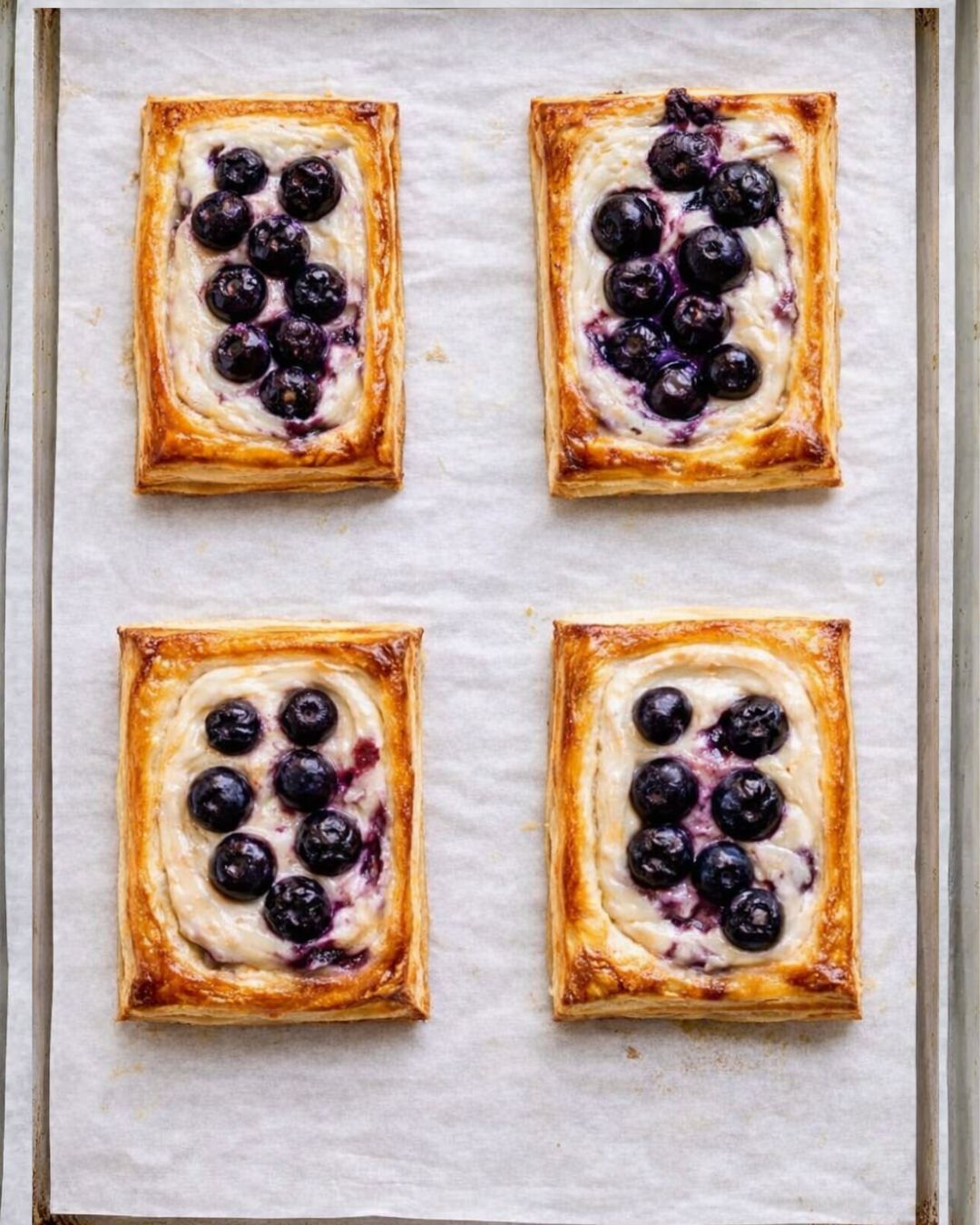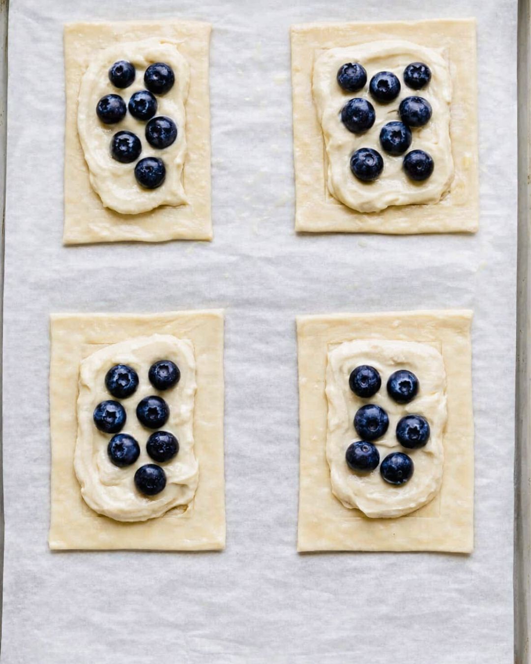 • Assemble the danishes by spooning the cream cheese mixture into the center of each rectangle. Top each with a handful of fresh blueberries, distributing them evenly without overfilling.