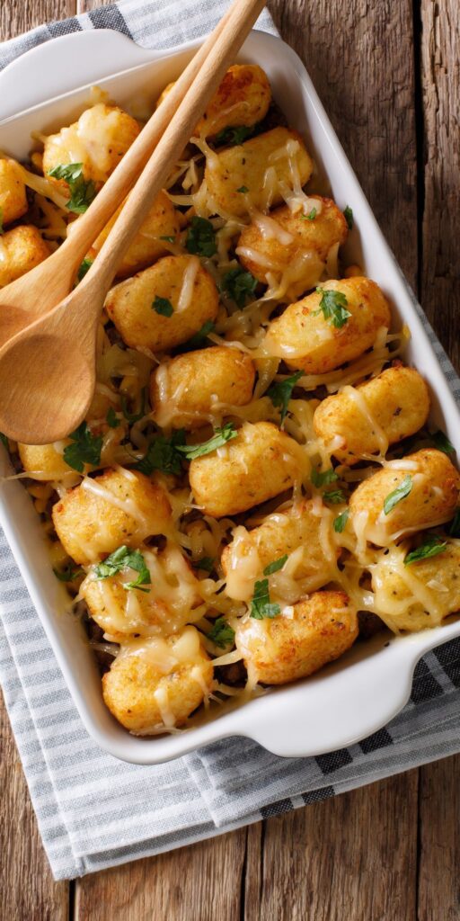 These cheesy loaded tater tots are topped with bacon, sweet corn, and melted cheese that pulls everything together. These cheesy tater tots work perfectly as a party appetizer, a side dish, or even a fun, casual meal. You can also customize them with meat or beans to make them more filling.