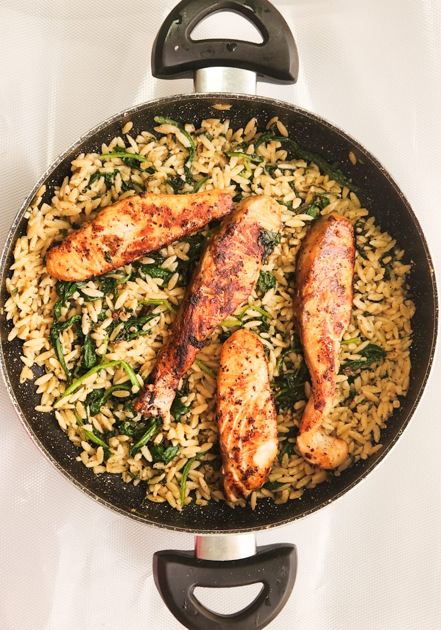 Everything cooks in a single pan, so you get juicy, perfectly seared salmon and creamy, lemony orzo with hardly any cleanup.