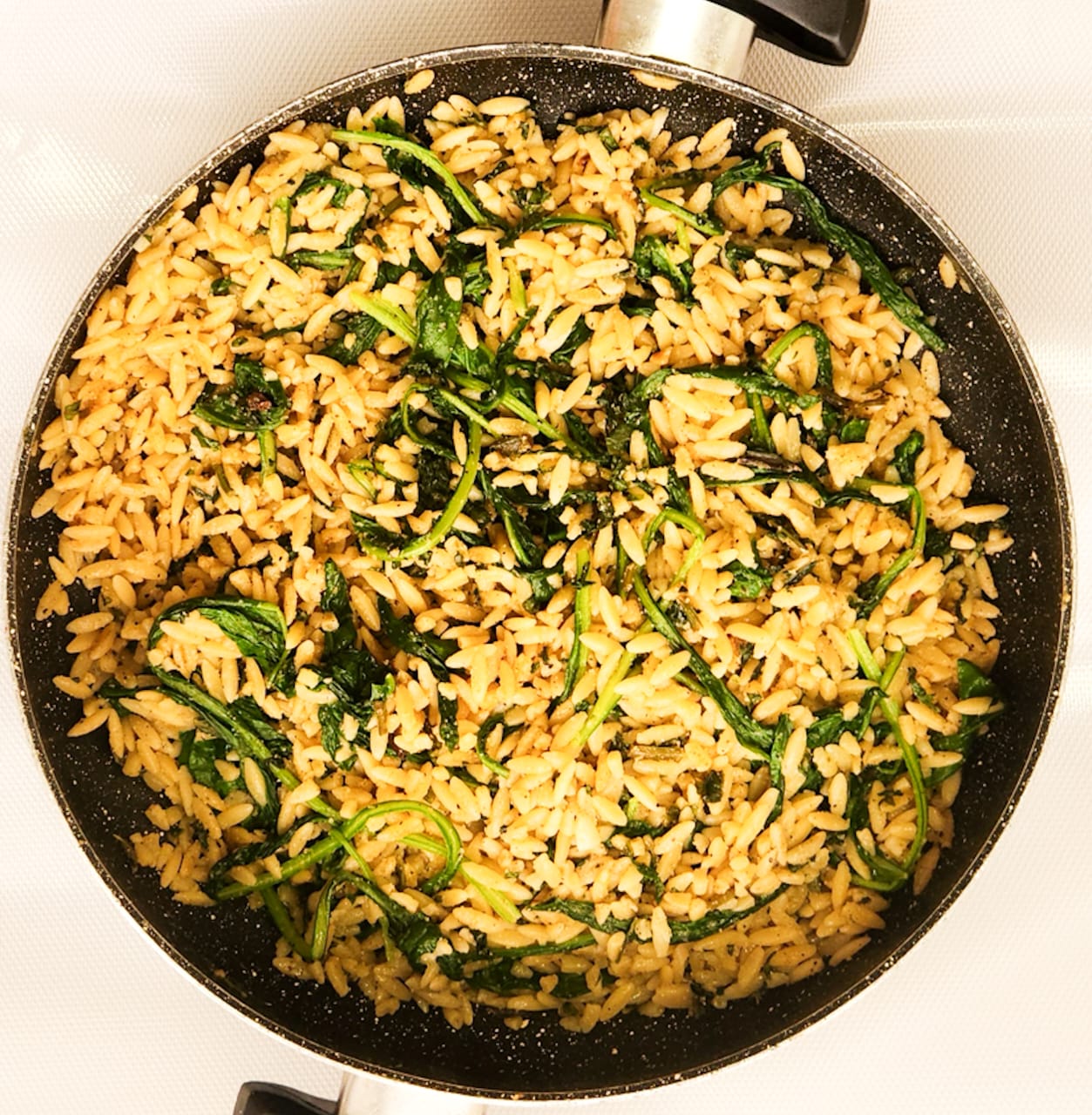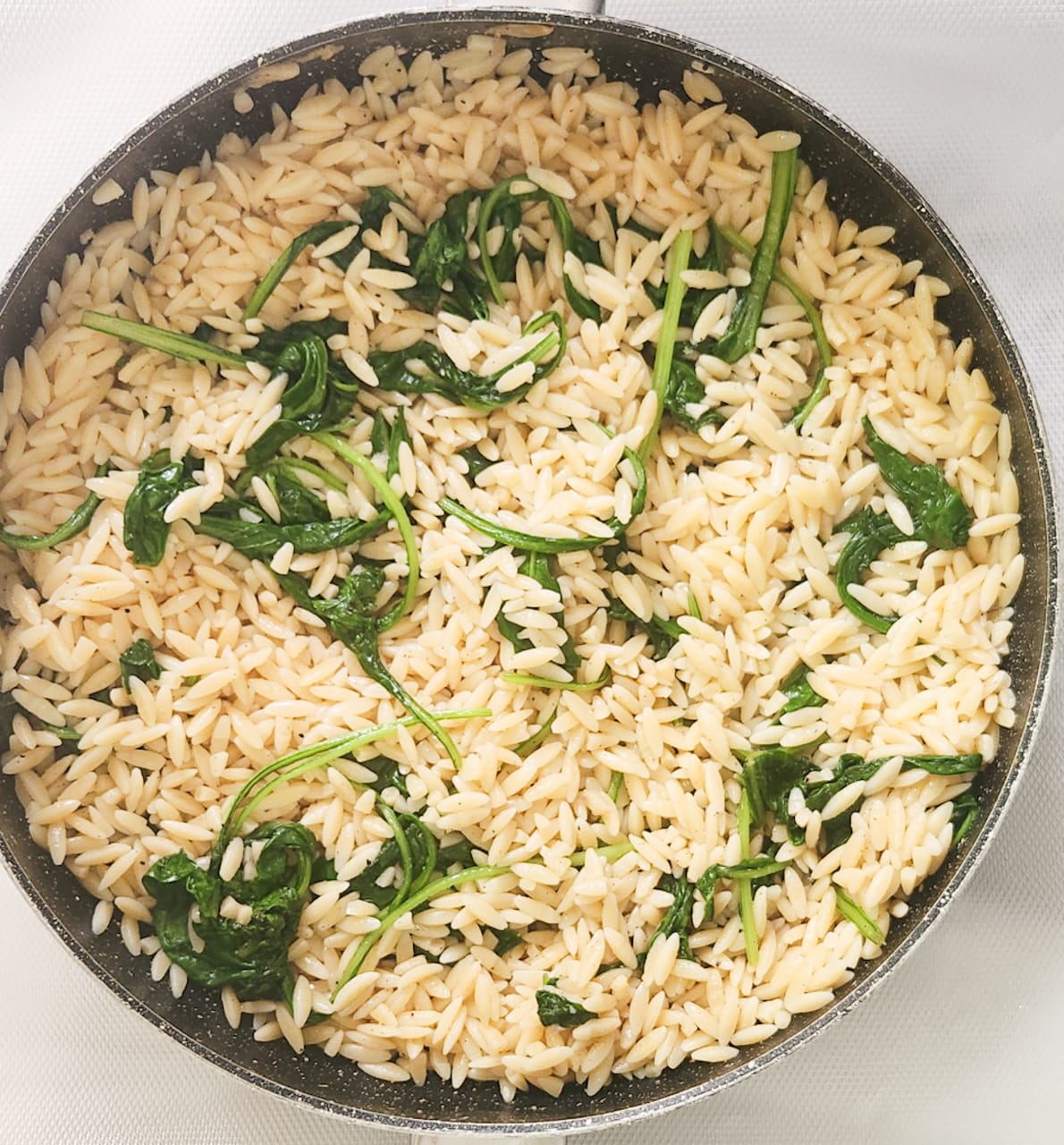 - Add the cooked orzo to the skillet and toss to combine with the spinach.