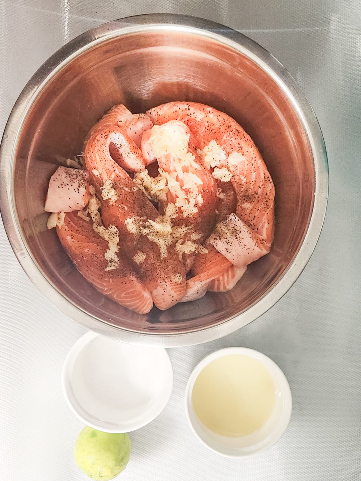 - Marinate the Salmon: Pat the salmon fillets dry. In a small bowl, mix the minced garlic, lemon zest, lemon juice, ½ teaspoon salt, and ½ teaspoon black pepper. Rub this mixture evenly over both sides of the salmon. Let it marinate for 30 minutes to 1 hour.