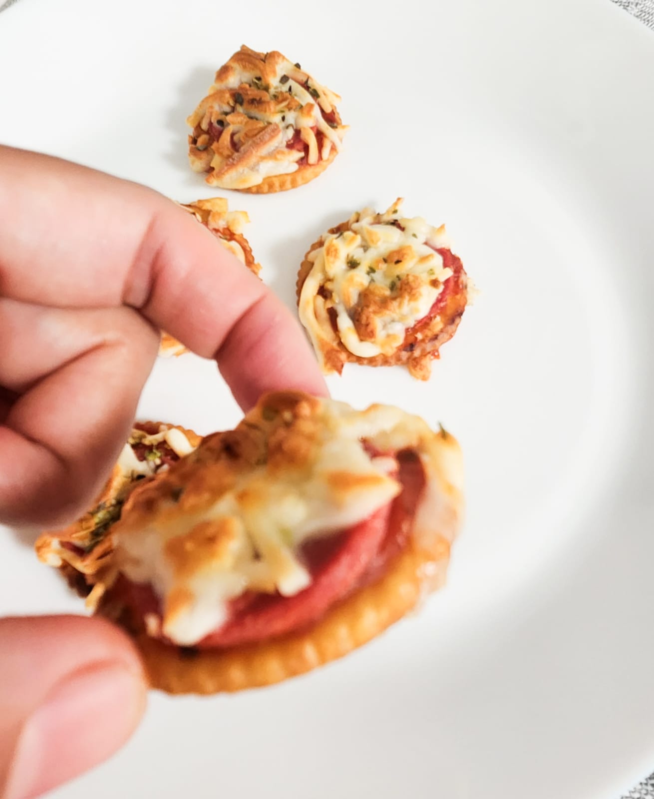 - Warm the pizza sauce slightly before spooning on the crackers. It spreads easier and melds beautifully with the cheese.