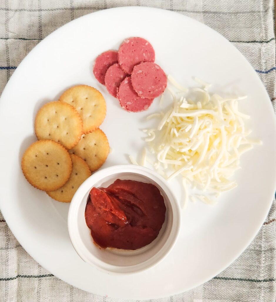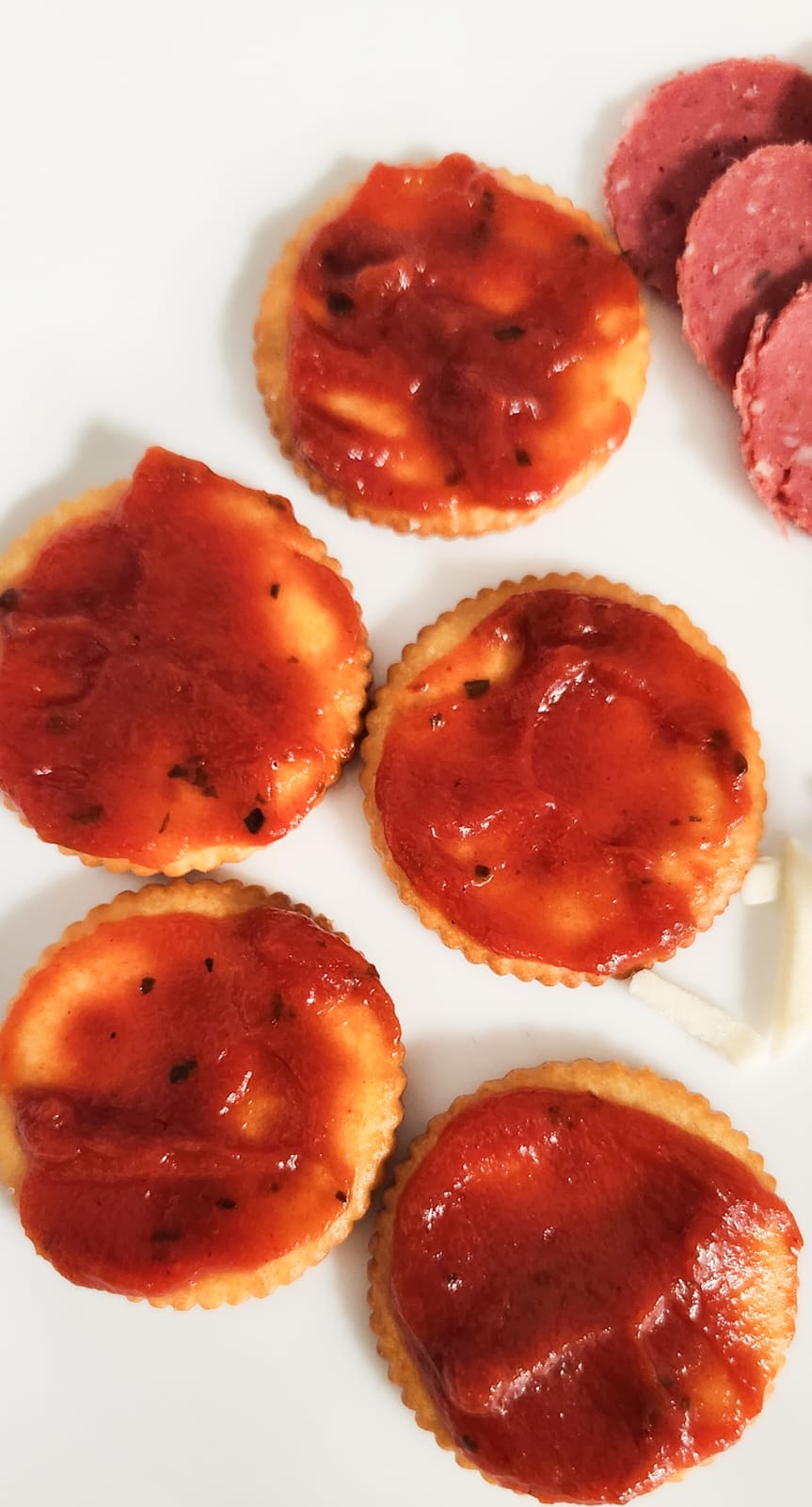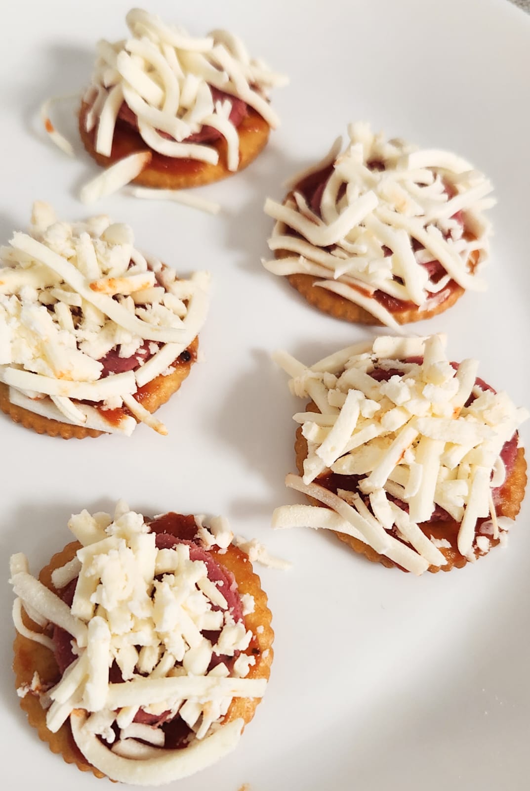 he back of the spoon. You want a thin, even layer, too much sauce can make crackers soggy. Next, add your toppings: a slice of pepperoni per cracker works perfectly, or small diced veggies if you prefer. This is also a great step to experiment with mini combinations, mushrooms, bell peppers, or olives all work well.