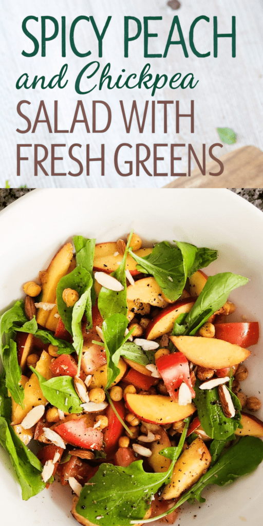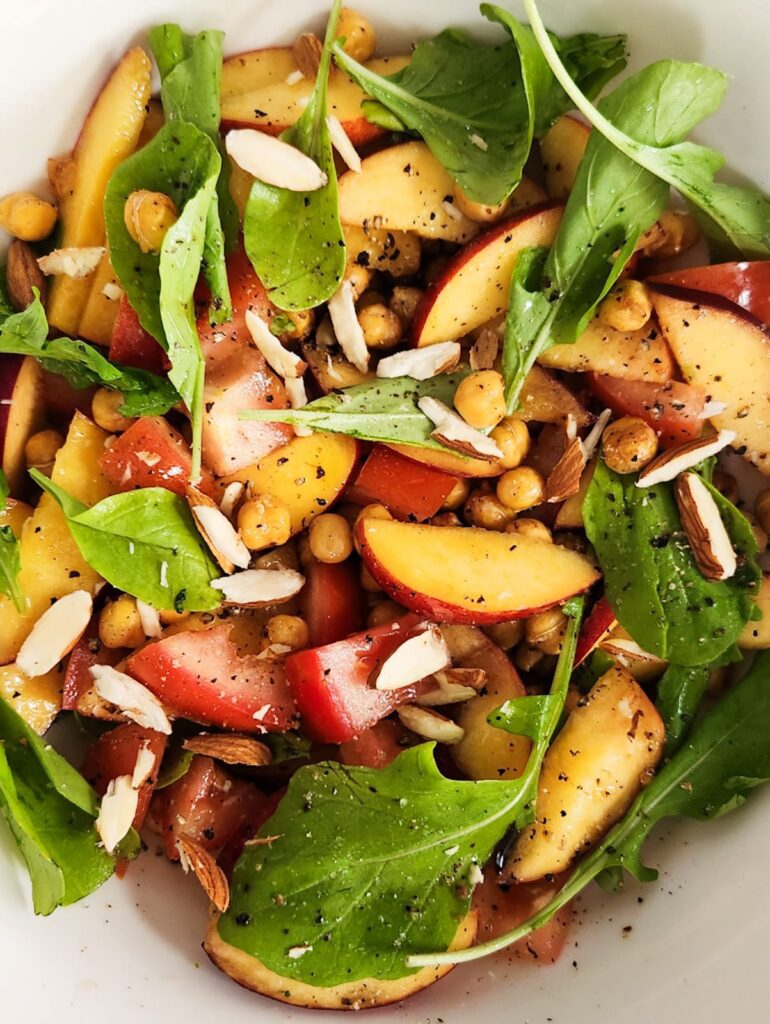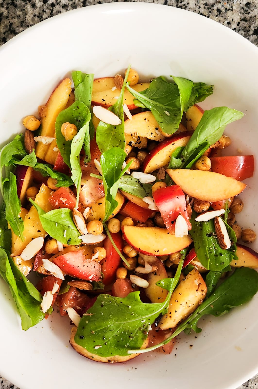 Made with ripe peaches, hearty chickpeas, juicy tomatoes, and crunchy almonds over a bed of peppery arugula, this salad comes together fast with simple, seasonal ingredients.