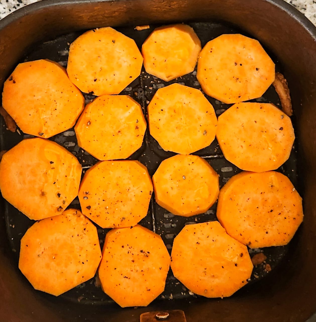 - Next, wash and slice the sweet potatoes into even rounds, about ½-inch thick. Consistency matters here—if the slices are uneven, some will burn while others stay undercooked.