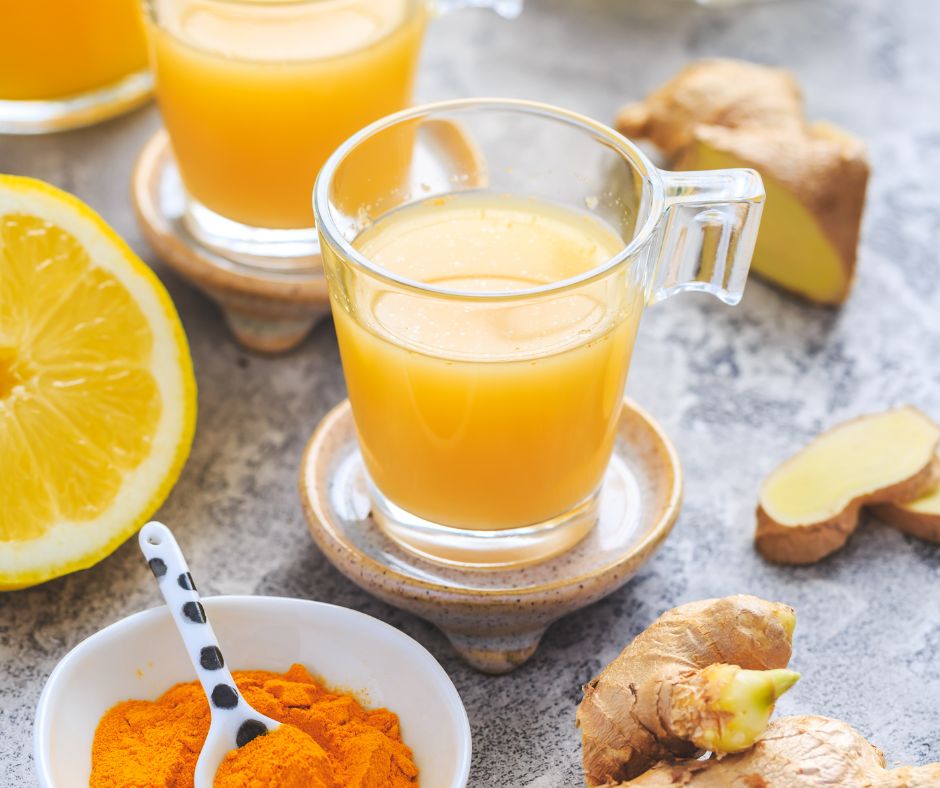 - In a glass, mix turmeric, grated ginger, and lemon juice.