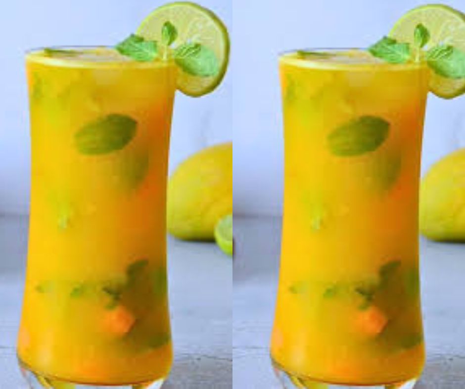 - Add mango pieces, lime juice, turmeric, sugar, and mint leaves to a blender.